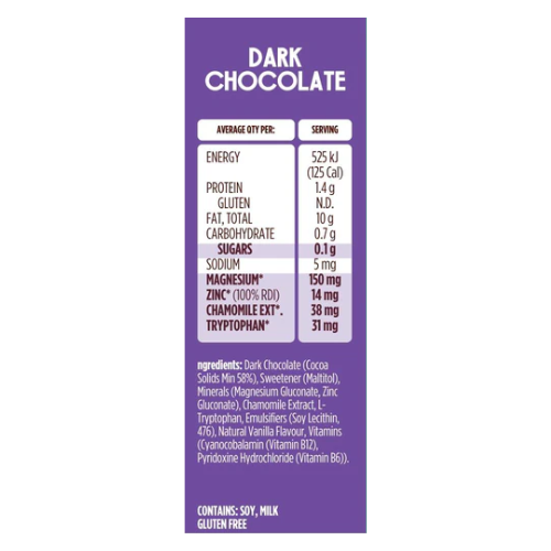 Enjoy a delicious all premium dark chocolate with magnesium, zinc & chamomile infusions to help unwind