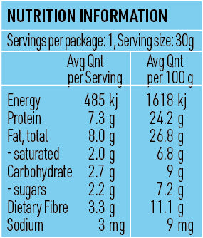Almonds, Peanut Butter, Almond Butter, Pasture Raised Collagen, Chicory Root Fibre, Peanuts, Cacao Mass, Organic Pea Protein, Tahini, Coconut Oil, Cacao Powder, Vanilla, Himalayan Salt, Probiotics