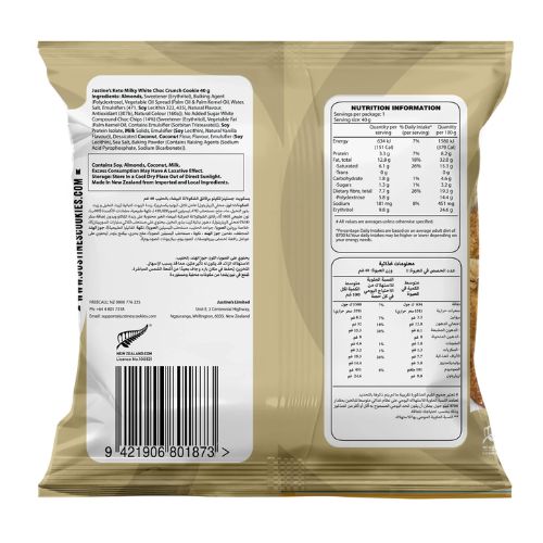 INGREDIENTS: Almonds, Sweetener (Erythritol), Bulking Agent (Polydextrose), Vegetable Oil Spread (Palm Oil & Palm Kernel Oil, Water, Salt, Emulsifiers (471, Soy Lecithin 322, 435), Natural Flavour, Antioxidant (307b), Natural Colour (160a)), No Added Sugar White Compound Choc Chips (14%) (Sweetener (Erythritol), Vegetable Fat (Palm Kernel Oil, Contains Emulsifier (Sorbitan Tristearate))), Soy Protein Isolate, Milk Solids, Emulsifier (Soy Lecithin), Natural Vanilla Flavour)), Dessicated Coconut, Coconut Flour, Flavour, Emulsifier (Soy Lecithin), Sea Salt, Baking Powder (Contains Raising Agents (Sodium Acid Pyrophosphate, Sodium Bicarbonate)).