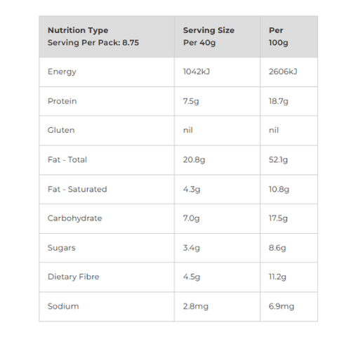 Nuts (58%) (Almonds 26%, Cashew, Coconut, Macadamia 8%), Seeds (29%) (Sunflower, Pumpkin, Sesame), Honey (Bush Manuka 2%), Rice Bran Oil, Fibre Rich Tapioca Syrup, Vanilla Extract, Natural Antioxidant (Rosemary Extract).