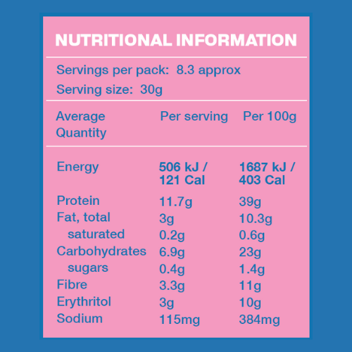 Ingredients: Soy Protein Isolate, Pea Concentrate, Erythritol, Canola oil, Pea starch, Cocoa powder (8%), Soy lecithin, Inulin from chicory root, Stevia extract, Natural flavours (chocolate).