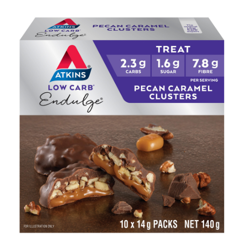ATKINSAtkins Low Carb Pecan Caramel Clusters Atkins Pecan Caramel Clusters are made with indulgent caramel and real roasted pecans wrapped in rich chocol...