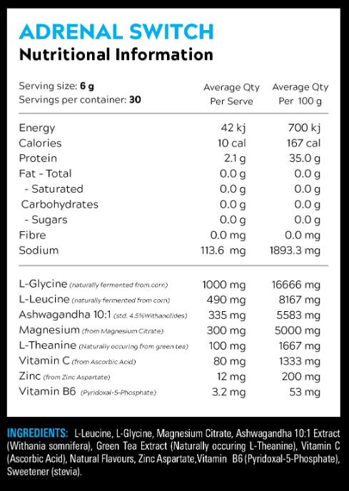Adrenal Switch is your ultimate key to unlocking recovery, relaxation, and overall wellbeing. Specially formulated with a potent blend of essential minerals such as magnesium and amino acids, it’s designed to help your body recharge and repair after intense exercise.