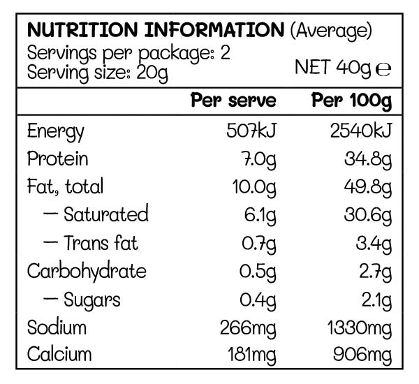 Ingredients: Cheddar Cheese (pasteurised cow's MILK, salt, non-animal rennet, culture), anticaking agent (460), canola oil, natural flavour and seasoning.