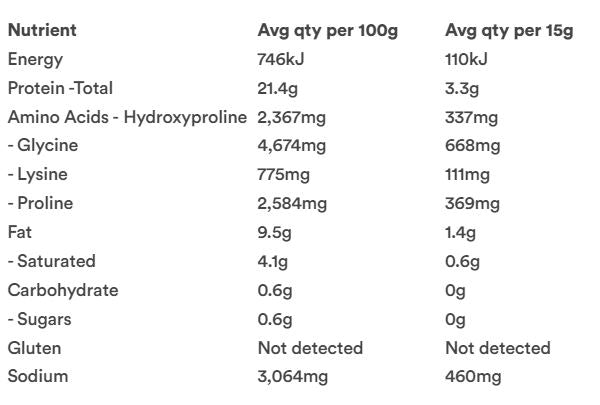 100% Grass-Fed Beef Bones (60%), Fire Tonic (30%) (Aged Raw Unfiltered Apple Cider Vinegar, Raw Honey, Chillies, Turmeric, Garlic, Horseradish, Ginger, Carrot, Celery, Red Onion, Brown Onion, Apple, Orange, Lemon, Brown Mustard Seed, Parsley, Rosemary, Oregano, Thyme, Juniper Berries, Black Peppercorns, Bay Leaves, Szechuan Pepper, Himalayan Salt), Naturally Evaporated Sea Salt, Turmeric, Ginger, Black Pepper, Lemon Myrtle