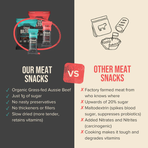 Introducing an adventure snack bar – a clean, meaty snack bar to satisfy your savoury cravings. Each snack bar starts off as 80g of organic grass-fed beef brisket and topside. The beef is slow dried to create a tender and easy-to-eat snack bar that's packed full of flavour and nutrients. Whether you're embarking on a new adventure or simply need a quick, satisfying snack, our beef bars are the perfect choice.