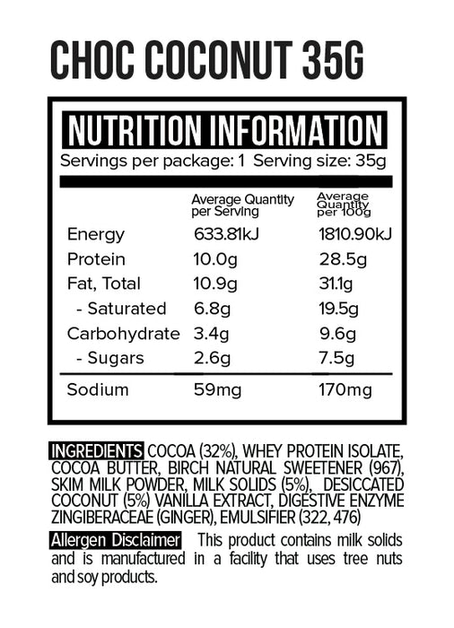Cocoa (32%), Whey Protein Isolate, Cocoa Butter, Birch Natural Sweetener (967), Skim Mil Powder, Milk Solids (5%), Desiccated Coconut, Vanilla Extract, Digestive Enzyme Zingiberaceeae (Ginger), Emulsifier