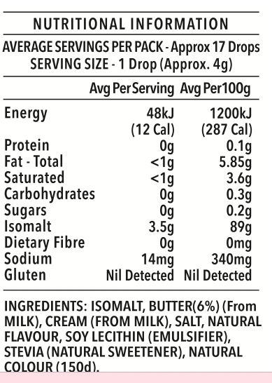 Isomalt, Butter (6%) (From milk), Cream (From milk), Salt, Natural Flavuors, Soy Lecithin (Emulsifier), Stevia (Natural Sweetener), Natural COlour (150d).
