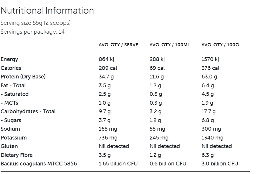 Protein Blend (Whey Protein Concentrate, Micellar Casein, Whey Protein Isolate), Dietary Fiber (Fibersol-2®), Flavours, Cocoa Powder, LSA (Linseed-Sunflour-Almond), Guar Gum, Xanthum Gum, Probiotics (Lactobacillus acidophilus 15 billion CFU, Bifidobacterium lactis 15 billion CFU), Minerals (Potassium Citrate, Calcium Phosphate, Tricalcium Phosphate, Sodium Chloride), Magnesium Oxide, Himalayan Salt, Digestive Enzyme (Bromelain ), Stevia, Vitamin C (Ascorbic Acid), Zinc Sulfate Monohydrate, Iron (Ferrous Fumerate), Vitamin E (dl-alpha Tocopherol), Vitamin B3 (Niacin), Vitamin B5 (Pantothenic Acid), Manganese Sulfate, Vitamin B2 (Riboflavin), Copper Sulphate Anhydrous, Vitamin B6 (Pyridoxine Hydrochloride), Vitamin B1 (Thiamin Hydrochloride), Vitamin A (Retinyl Acetate), Potassium Iodine, Folic Acid, Chromium Sulphate, Molybdenum (Sodium Molybdate), Selenium (Sodium Selenite), Vitamin K1 (Phytonadione), Vitamin H (Biotin), Vitamin D3 (Cholecalciferol), Vitamin B12 (Cyanocobalamin)