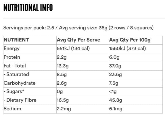 Cacao (Min. 65%; Cacao Butter, Cacao Mass, Cacao Powder), Coconut Milk Powder, Chicory Root (Prebiotic Fibre), Inulin (Plant Based Prebiotic Fibre), Cassava Flour (Fibre), Shredded Coconut, Sea Salt, Natural Vanilla, Sunflower Lecithin, Monk Fruit.