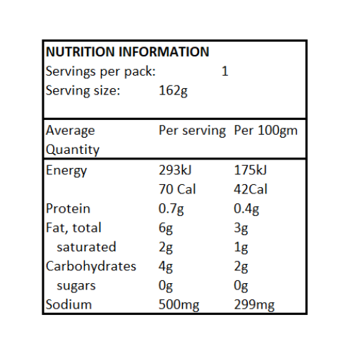 Ingredients: KONJAC NOODLES: Water, Konjac powder, Citric Acid. SAUCE: Water, White sugar, Vegetable oil, Edible salt, Onion, garlic, Curry powder, Ginger, Tomato paste, Red sweet pepper powder, Yeast extract, Pepper powder, Spice (black pepper powder, onion powder), Edible essence, 5’- flavored nucleotide disodium, Citric acid. VEGETABLES: Onion, Carrot.