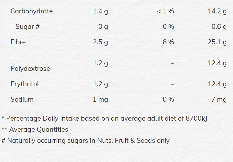 Dark Chocolate 73% [Cocoa Solids (Cocoa Butter, Cocoa Mass), Soluble Dietary Fibre (Polydextrose), Erythritol, Natural Emulsifiers (476, Non GMO Sunflower Lecithin)], Natural Vanilla Flavour, Natural Sweetener (Stevia)], Pepitas, Roasted Almonds, Sunflower Seeds, Linseeds, Chia Seeds, Shredded Coconut, Cardamon, Turmeric.