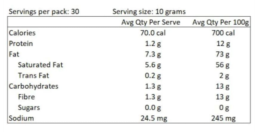 Coconut Oil, Grass-Fed Butter, Soluble Fibre, Acacia Gum Fibre (prebiotic), Protein (from dairy), Vitmain E