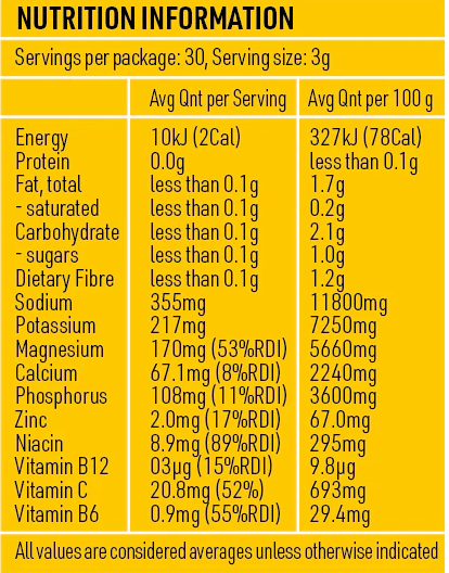 Magnesium Citrate, Salt (Sodium Chloride), Potassium Citrate, Citric Acid, Natural Lemonade Flavour, Calcium Phosphate, Sunflower Lecithin, Stevia, Ascorbic Acid, Zinc Gluconate, Vitamin B3, Vitamin B5, Vitamin B6, Vitamin B12.