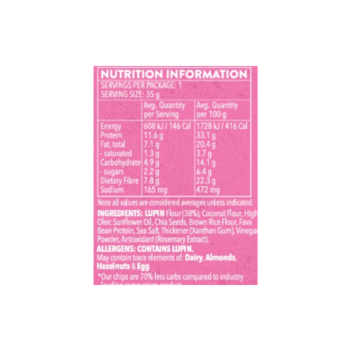 Lupin Flour (38%), Coconut Flour, High Oleic Sunflower Oil, Chia Seeds, Brown Rice Flour, Fava Bean Protein, Sea Salt, Thickener (Xanthan Gum), Vinegar Powder, Antioxidant (Rosemary Extract).