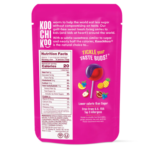In addition to being sugar-free, Koochikoo candies are certified Kosher, Halal, and Vegan. We're also free from all common allergens and lower calorie than sugar candies.