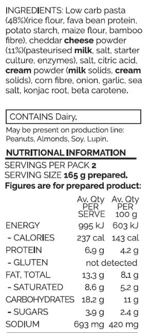 Ingredients: Low carb pasta (48%)(rice flour, fava bean protein, potato starch, maize flour, bamboo fibre), cheddar cheese powder (11%)(pasteurised milk, salt, starter culture, enzymes), salt, citric acid, cream powder (milk solids, cream solids), corn fibre, onion, garlic, sea salt, konjac root, beta carotene. CONTAINS Dairy