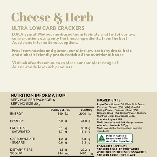 Made with Australian Lupin flour and Aussie Cheese, these crackers are a crowd favourite. Pair with cheese, dips and your favourite grazing goodies.