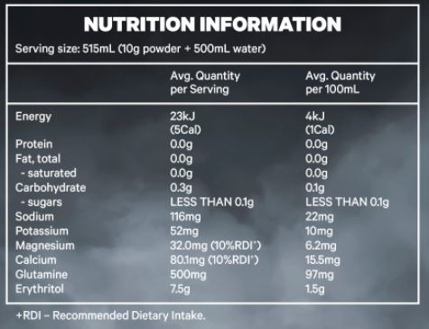 Sweetener (Erythritol), Acidity Regulators (Citric Acid, Potassium Citrate, Malic Acid), Minerals (Calcium Citrate, Magnesium Citrate), L-Glutamine, Beetroot Juice Powder, Salt, Flavours, Sweetener (Sucralose).