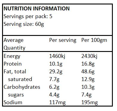 Allergens: may be traces of other tree nuts, eggs, milk, soy, fruit, grains, gluten, cinnamon