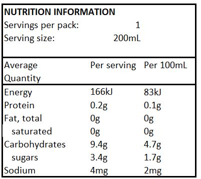Ingredients: Water, Reconstituted fruit juice [Pineapple (13.7%), Orange (7%), Passionfruit (0.5%)], Sweetners [erythritol, Steviol Glycosides (Stevia)], Acidity regulator (citric acid), Natural flavours.