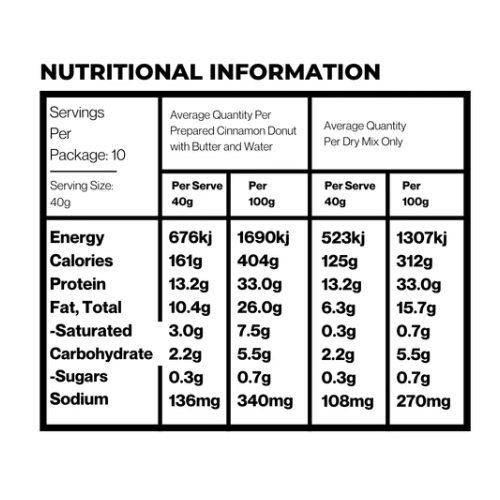 100% Almond Kernels (that have been blanched). Whey Protein Concentrate, Milk Protein Isolate, Whey Protein Isolate, Whey Fractions, L Glutamine, Flavouring, Xanthan Gum, Lactase Enzyme, Sweetener (Sucralose <1%), Erythritol, Organic Stevia Glycosides (0.56%), Whole Egg Powder, Baking Powder, Cinnamon Powder.